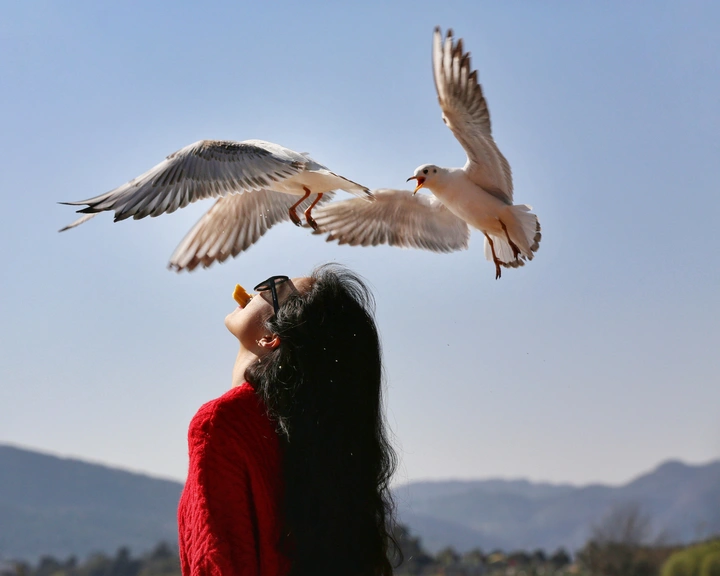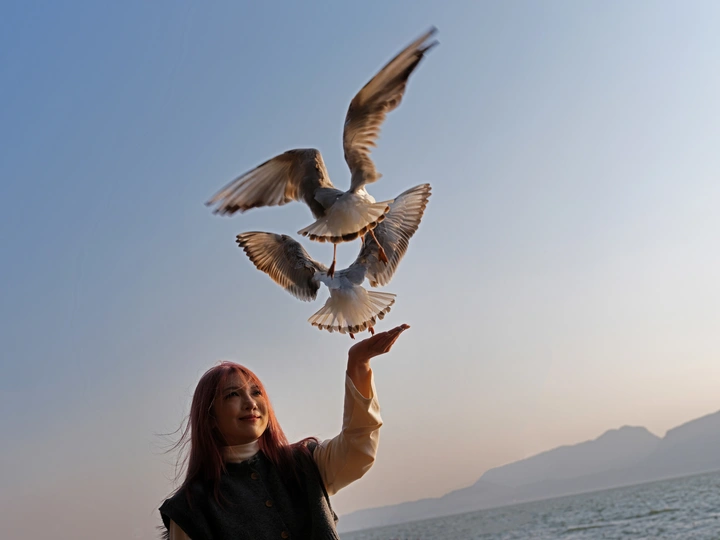 唇间的邀约,天空的回应。她微抬下颌,用唇间的面包屑发出邀约,两只红嘴鸥应声而来,翅膀扇起的风拂过她的发梢。澄澈的蓝天与远山作伴,这场与飞鸟的互动,是人与自然最诗意的对话,每一次振翅都在诉说着信任与温柔。