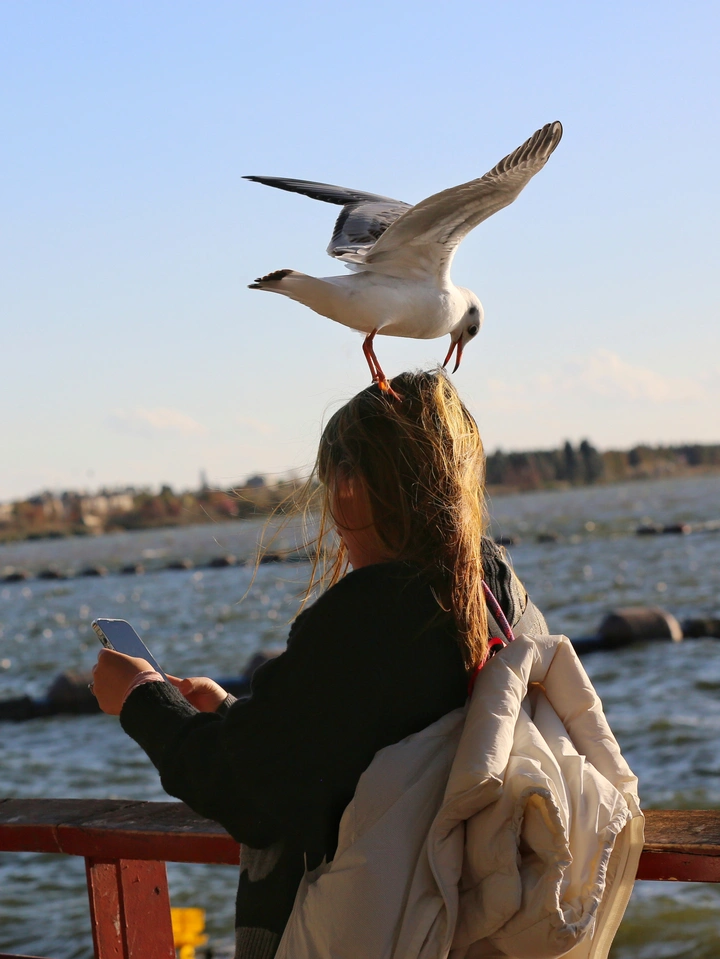 当海鸥成了“发型师”。她倚着栏杆眺望湖面,指尖还在手机上滑动,一只海鸥却突然俯冲而下,稳稳停在她的头顶。海鸥扑棱着翅膀,像是在为她整理发型,橙红的喙尖几乎触碰到她的额头。波光粼粼的水面与远处的树影成了背景,这场意外的邂逅,让旅途的记忆多了一抹鲜活的色彩。