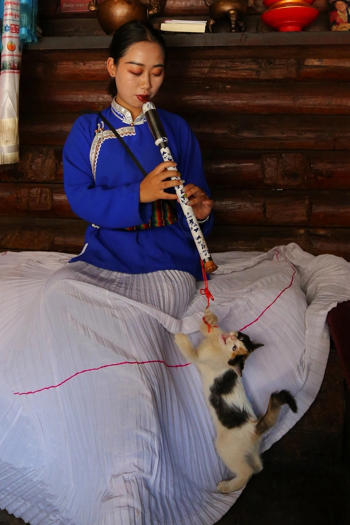 木屋里的时光协奏曲。原木墙面与铜器陈设,勾勒出浓郁的民族生活气息。蓝衣女子的笛声如清泉流淌,而脚边的三花小猫却成了“不速之客”,用小爪拨弄着笛绳,打破了静谧。传统乐器的雅致与萌宠的俏皮在此交融,让平凡的日常瞬间变得鲜活而治愈。