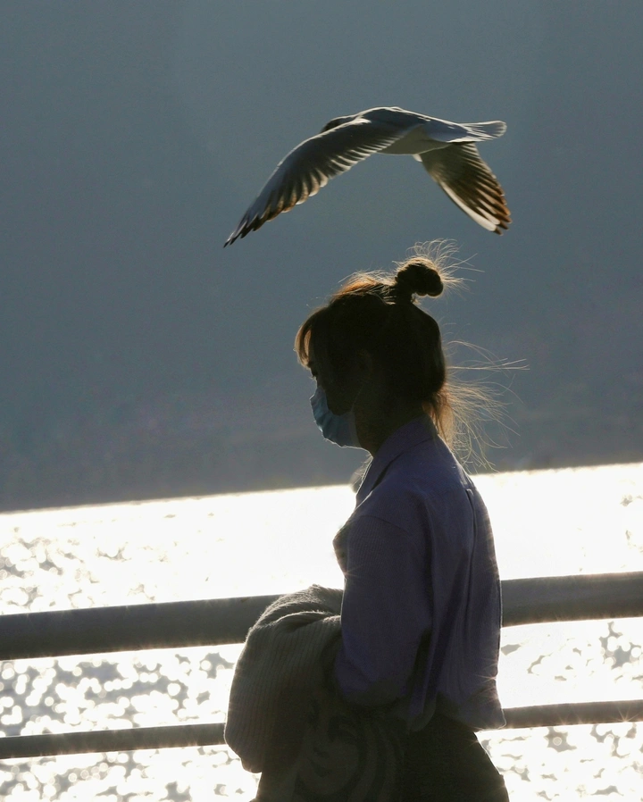 逆光把湖面铺成碎金,她静立栏杆旁,任晚风撩起发梢。一只红嘴鸥从头顶掠过,翅膀在灰蓝天幕下划出温柔的弧线。口罩遮不住眼底的松弛,她抱着针织外套,像抱着一整个冬天的暖意,与飞鸟共享这片刻的海风吹拂。