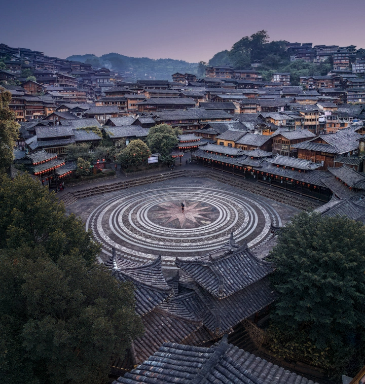 层层叠叠的苗族吊脚楼依山而建,黑瓦木楼在暮色中错落有致,勾勒出浓郁的民族建筑肌理。中心的圆形广场纹样精美,仿佛是苗族文化的图腾印记,与周围的传统建筑、茂密林木相融,在黄昏的光影里,既显古朴村落的静谧,又藏着少数民族文化的深厚底蕴,宛如一处定格了时光的秘境,将苗族聚居地的人文与自然之美娓娓道来。