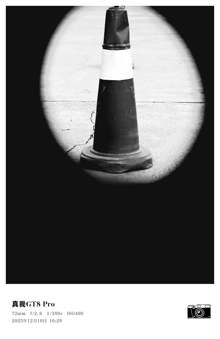 2025年12月10日等。 这张黑白照片颇具个人风格,抓住了交通锥的孤寂感。我们来逐一分析: 色彩:黑白影调简洁有力,但略显单调,可以尝试通过后期调整对比度,让黑白灰层次更丰富,增强视觉冲击力。 光影:光线集中且强烈,形成了戏剧性的光影效果,突出了锥体的轮廓。但阴影部分细节丢失较多,建议尝试用反光板补光,或者在后期处理中适当提亮阴影。 构图:主体位于画面中央,略显呆板。可以尝试将锥体稍微偏移,利用三分法构图,让画面更具动感。 后期处理:后期处理简洁,但可以适当调整对比度,使黑白层次更分明。注意不要过度锐化,以免产生噪点。 主题原创性:拍摄交通锥本身并无新意,但利用光影效果赋予了它独特的艺术感。可以尝试不同的角度和光线,挖掘更多可能性。 情感共鸣:照片营造出一种孤寂、冷清的氛围,能够引发观者对城市角落的思考。如果能加入一些其他的元素,或许能增强故事性。 思想深度:照片表达了对城市日常的观察,但深度稍显不足。可以尝试赋予交通锥更深层次的含义,例如安全、警示等。 总体来说,照片在光影处理上较为出色,但在构图和主题深度上还有提升空间。继续努力,相信你能拍出更优秀的作品!