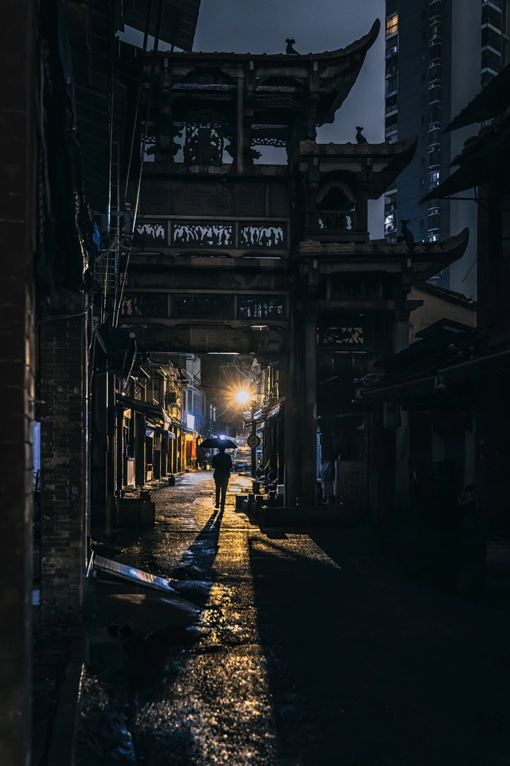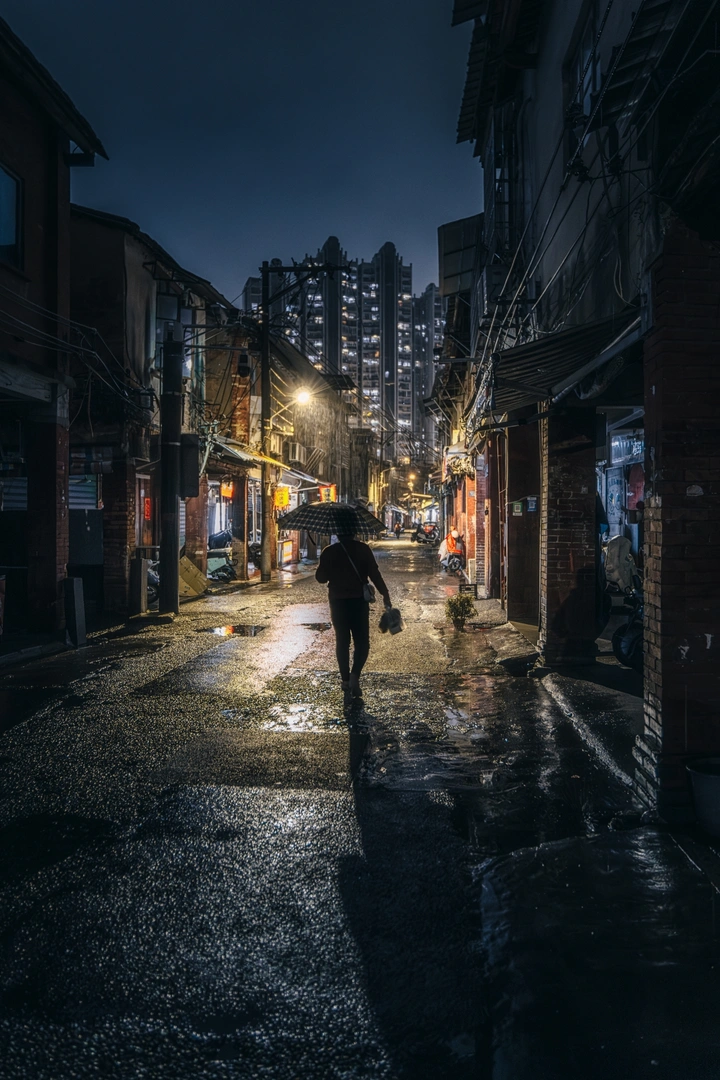 在城市的喧嚣中,偶然拐进一条雨夜的小巷。 交错的电线如细密的思绪,在头顶编织。地面的积水,似一面天然的镜子,倒映出暖黄的灯光和行人匆匆。